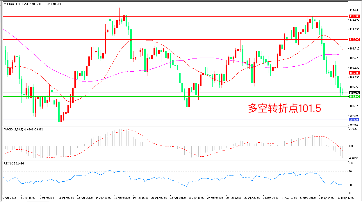 周二(5月10日),对全球经济复苏失速和需求疲软的担忧,叠加美元重新走强,令油价在美盘时段跌幅迅速放大,布伦特原油快速下跌,收报102.09美元/桶。美国能源信息署在刚刚发布的短期能源报告中下调了中美两国的消费增长预期,如果其他两大机构的预测与此一致,可能会再次对油价形成冲击。