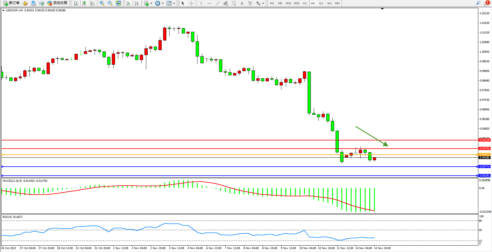 美元瑞郎USDCHF——4小时K线图显示: