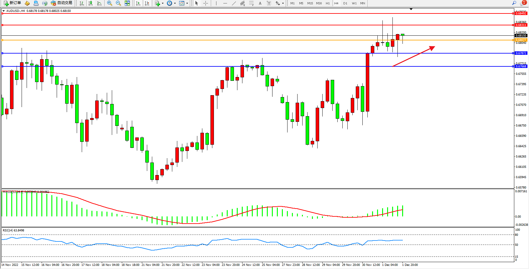 备选策略:0.68077下方看跌,目标0.67872、0.67668