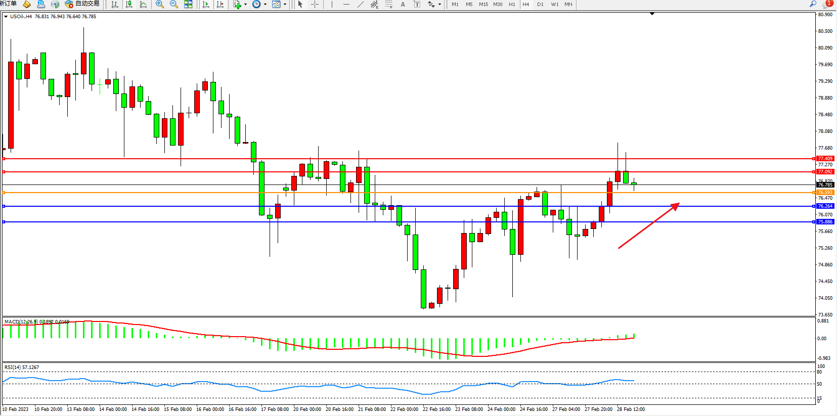 交易策略:76.593上方看涨,目标77.092、77.409