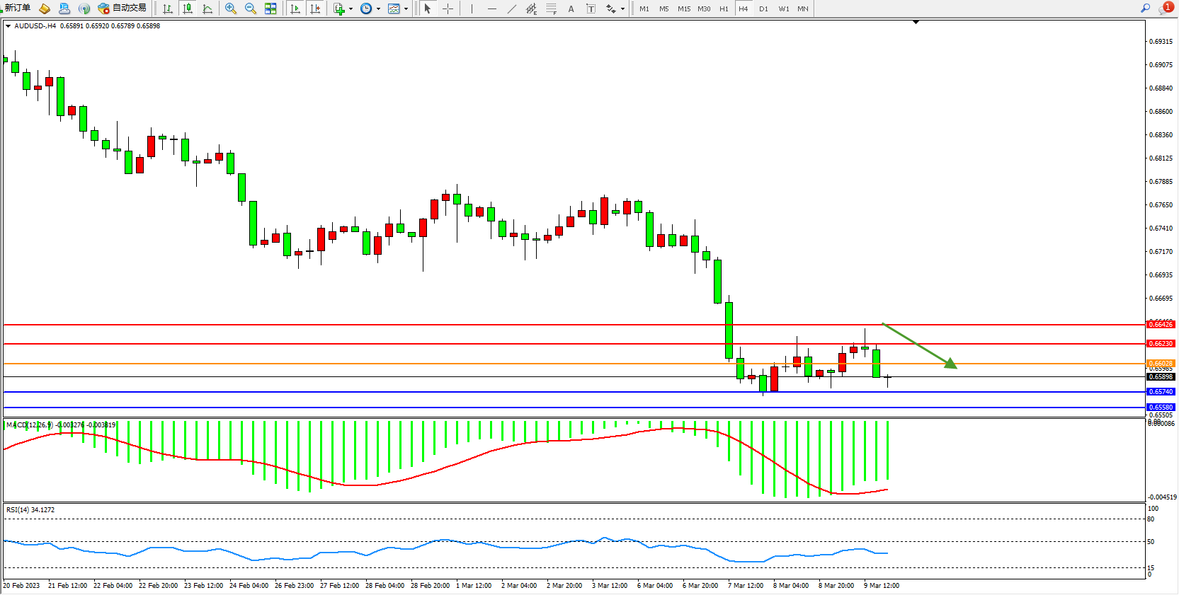 交易策略:0.66028下方看跌,目标0.65740  0.65580