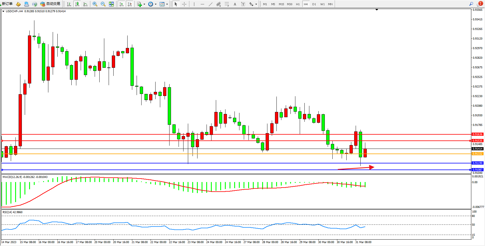 美元瑞郎USDCHF——4小时K线图显示: