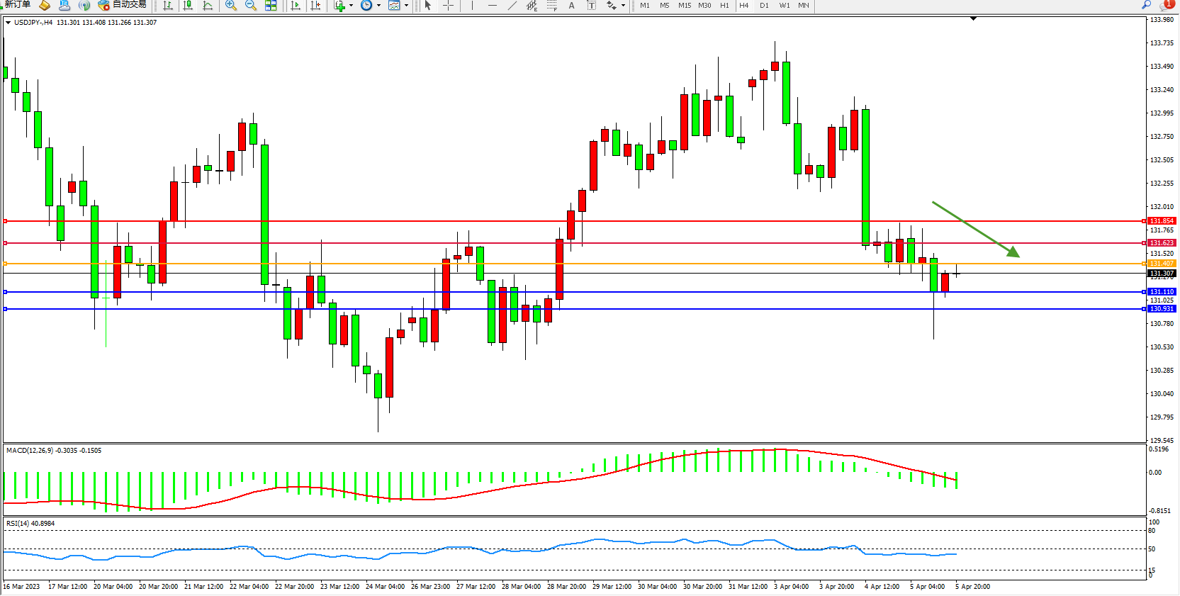 交易策略:131.407下方看跌,目标131.110  130.931