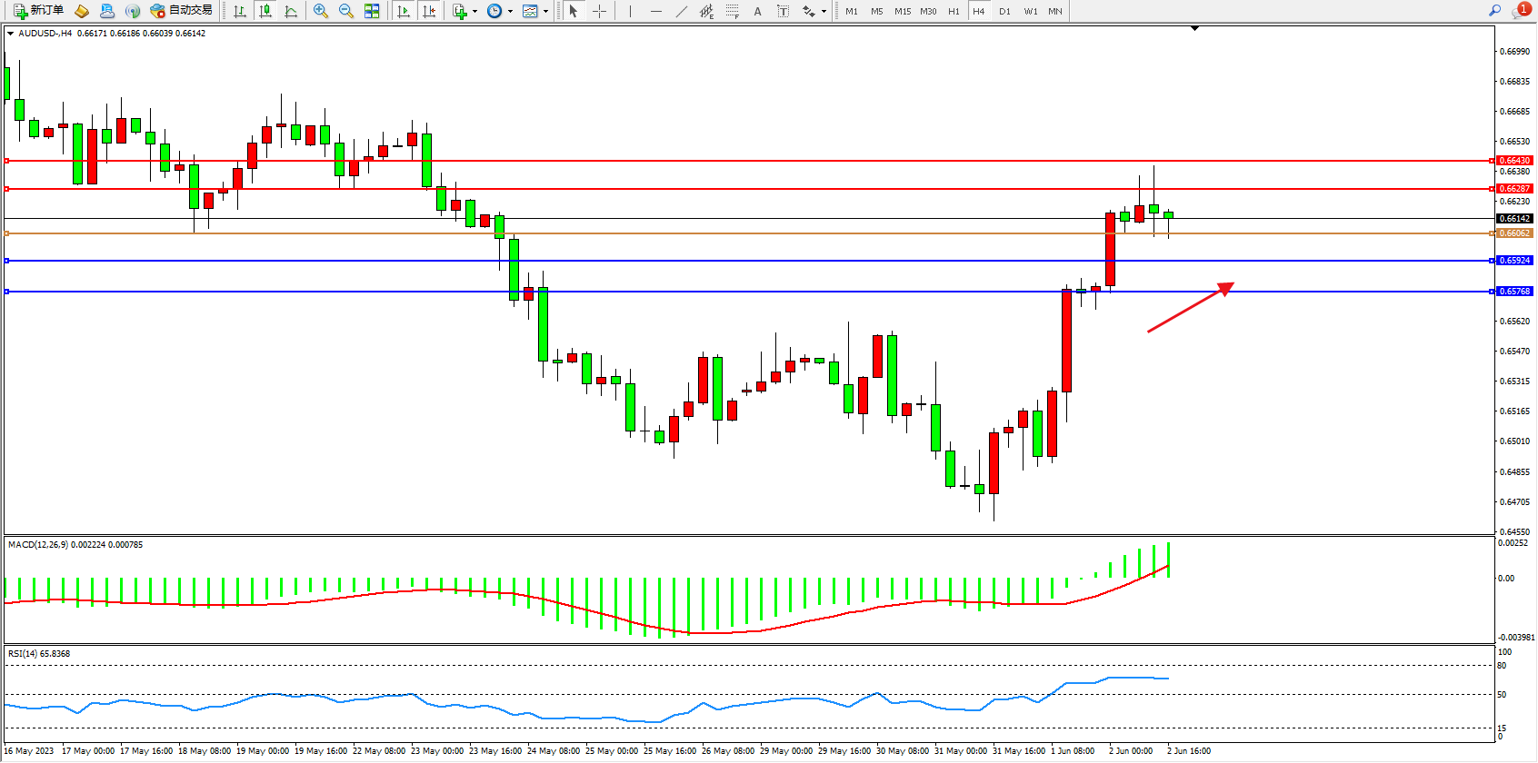 交易策略:0.66062上方看涨,目标0.66287 0.66430