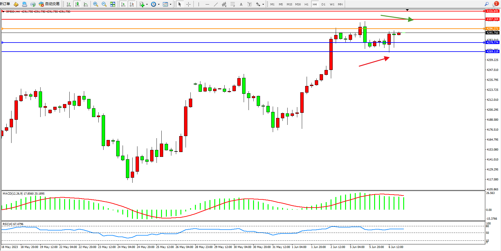 标普SP500——4小时K线图显示: