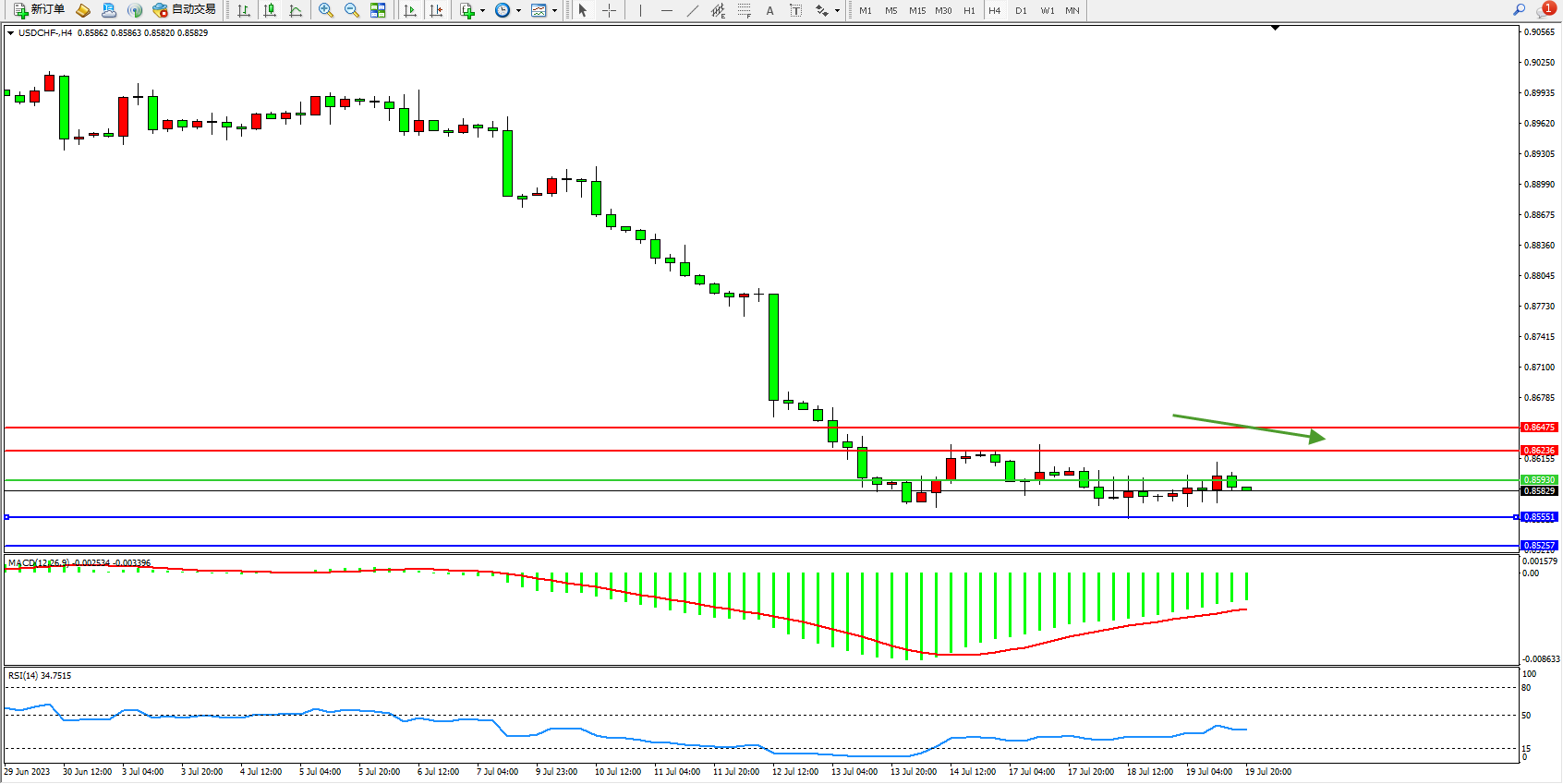 美元瑞郎USDCHF——4小时K线图显示: