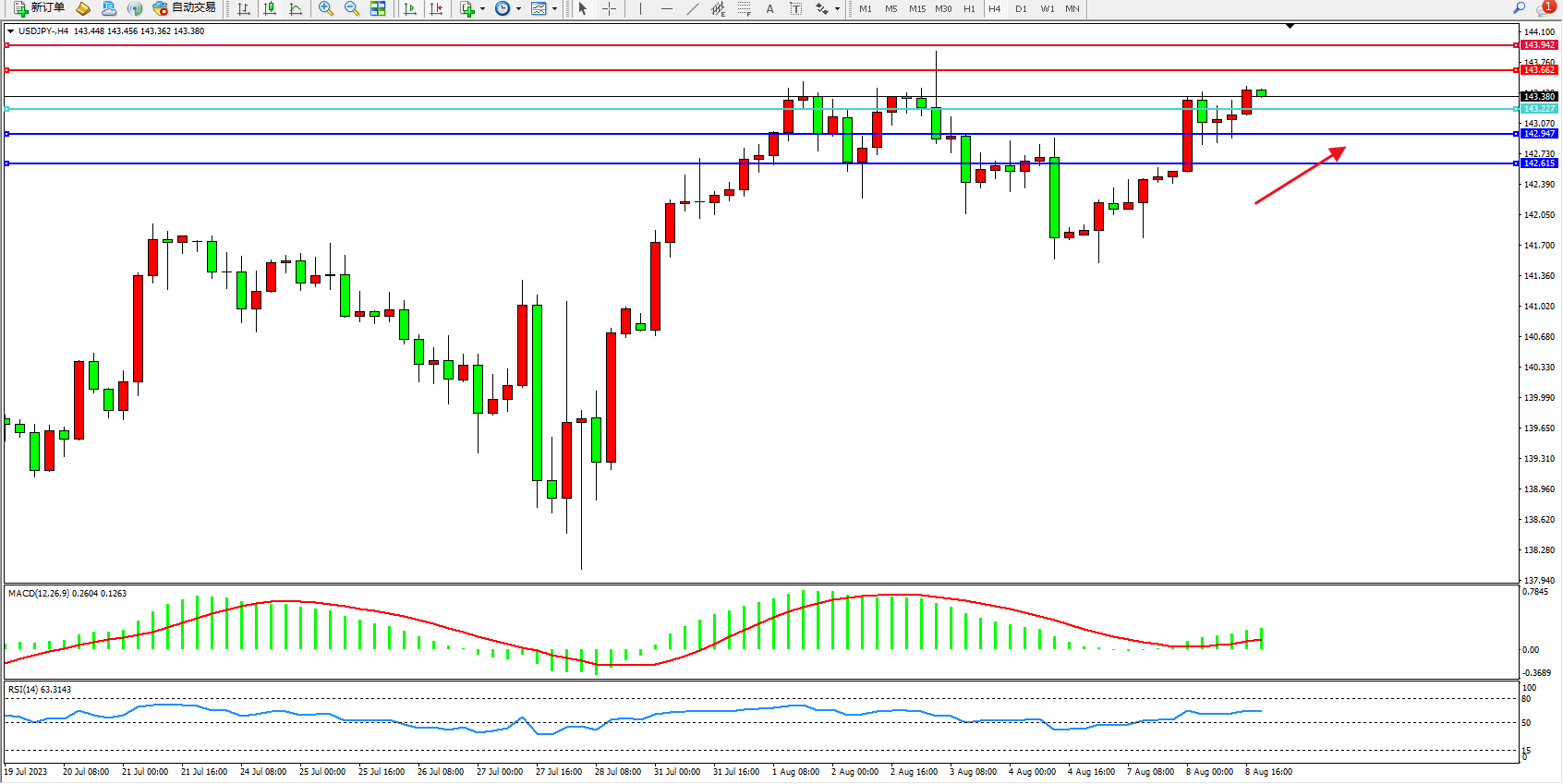 交易策略:143.227上方看涨,目标143.662  143.942
