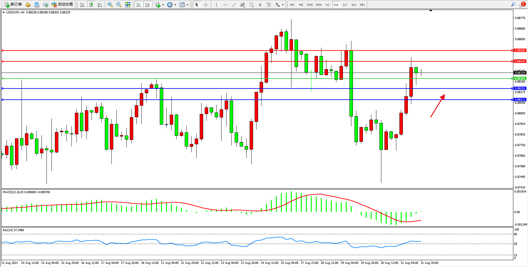 美元瑞郎USDCHF——4小时K线图显示: