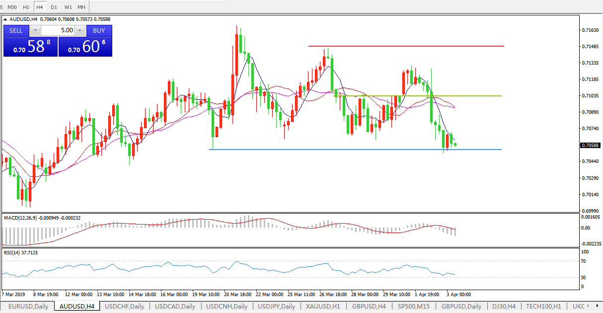 澳洲联储公布4月份利率决议,连续第29次维持1.5%低利率不变。由于其提到全球经济下行风险有所上升,且房地产市场依旧疲软,短线澳元兑美元冲高回落,现报0.7086,日内跌幅0.38%。澳洲联储官员一直对未来可能继续降息的前景持闪烁回避态度,但业内机构已经普遍预测其将在年内降息1-2次。42日澳大利亚政府本交易日将发布预算案,这至少可以为其经济带来喘歇,澳元汇价短线或许有望迎来反弹。