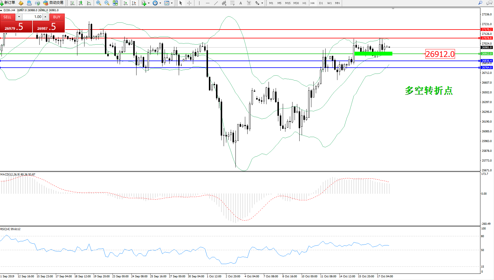 道琼斯指数DJ30—— 4小时K线图显示: