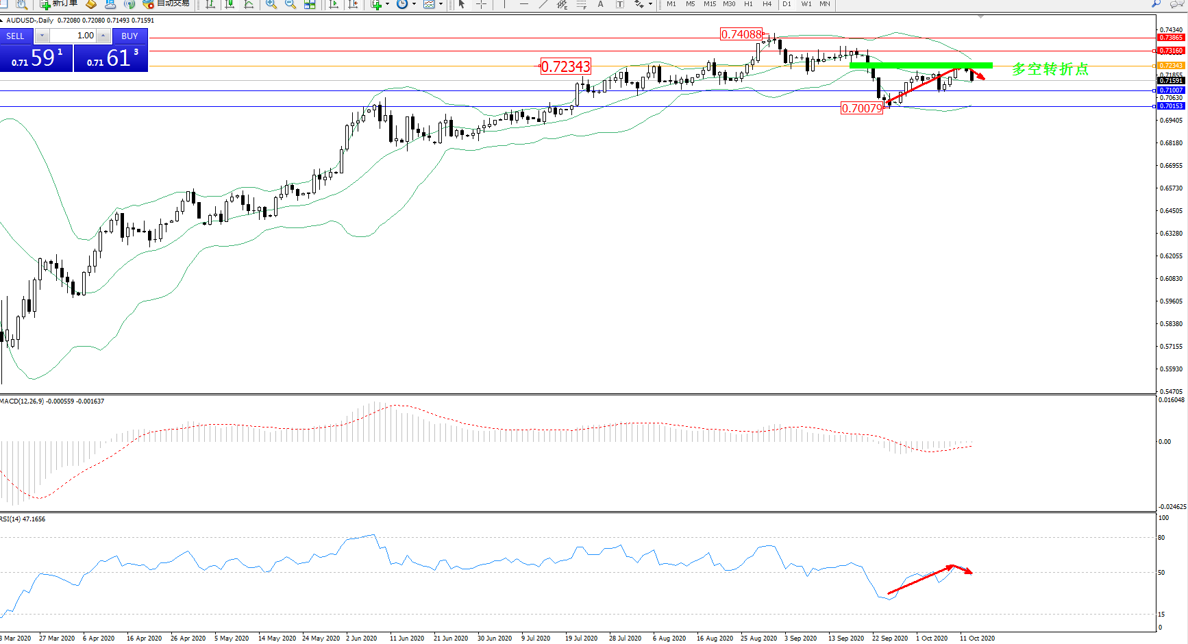 备选策略:0.72343上方看涨,目标0.73160、0.73865