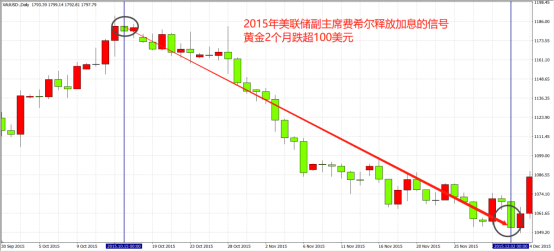 2015年,美联储副主席费希尔释放年底加息的信号,虽当日黄金不跌反涨,但年底加息预期炒作,黄金大跌近150美金。