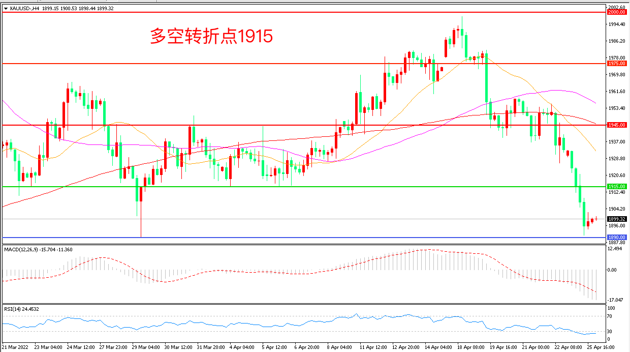 周一(4月25日),虽然美国国债收益率下降,但美元仍在走强,现货黄金突遭大单砸盘,长阴下坡后,收报1900美元/盎司。美联储主席鲍威尔及其他委员发出的任何愿意牺牲经济增速以控制通胀的额外信号都将打压金价。由于美联储的强势表态,黄金的吸引力正在收到威胁,不过,本周美联储进入噤声期,金价的允许方向将取决于美联储5月会议来临前的美国GDP和PCE数据。
