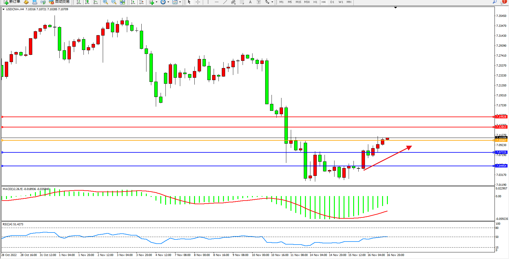 交易策略:7.10167上方看涨,目标7.12853、7.14928
