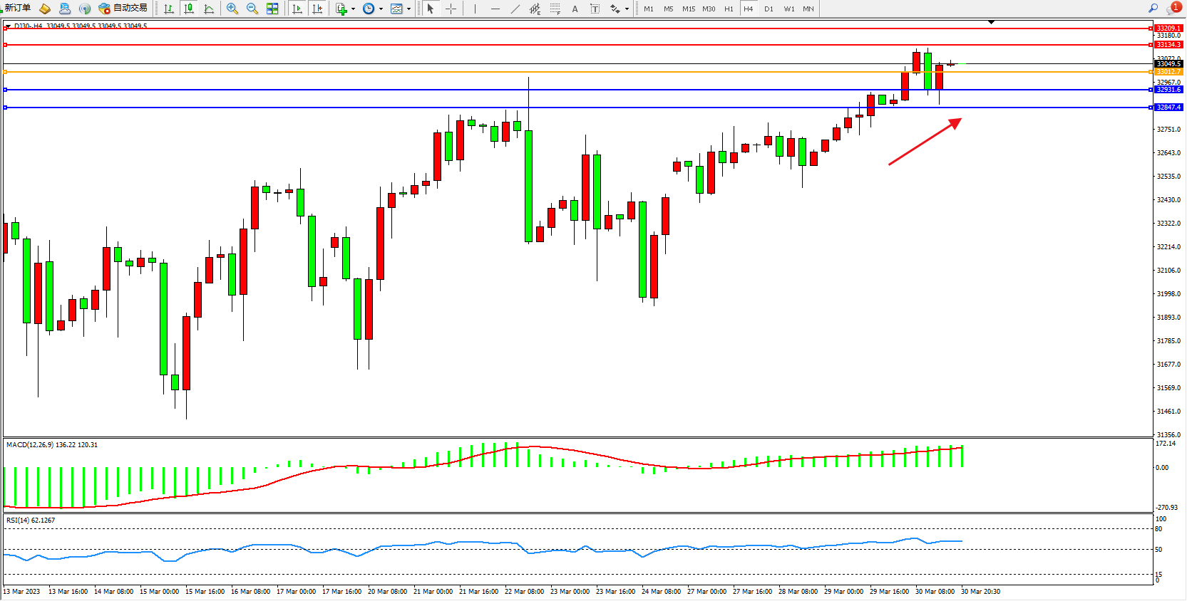 交易策略:33012上方看涨,目标33134  33209
