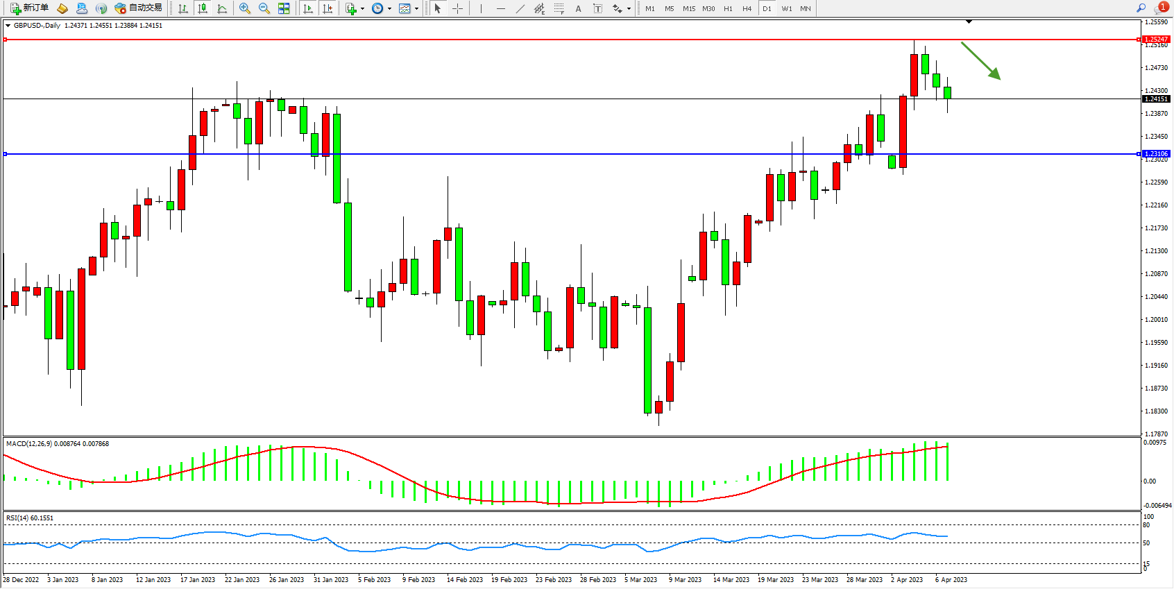 英镑兑美元日K线图显示: