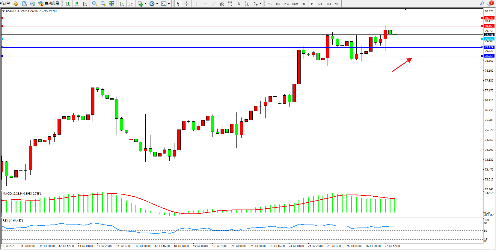 交易策略:79.566上方看涨,目标80.168 80.546